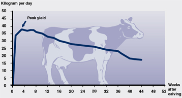 在下面的圖表里,上面的曲線是理想的泌乳曲線;奶牛產犢,奶量增加并達到產奶高峰,然后產奶量緩慢下降,直至停止擠奶。這是一個理想曲線, 只能在牛產犢時體況評分為3.5的條件下才能得到。