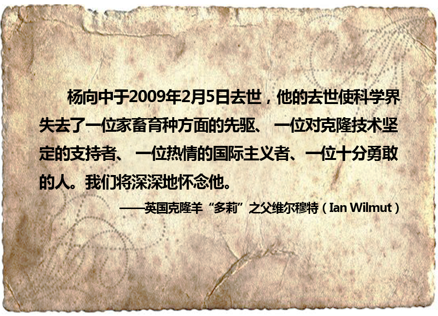 在與病魔進行了長達12年的斗爭后,楊向中于2009年2月5日在美國波士頓病逝,享年49歲。他因克隆大型動物被《吉尼斯世界紀錄》收錄,他的科研人生壯麗輝煌,他的名字被載入《世界名人錄》。