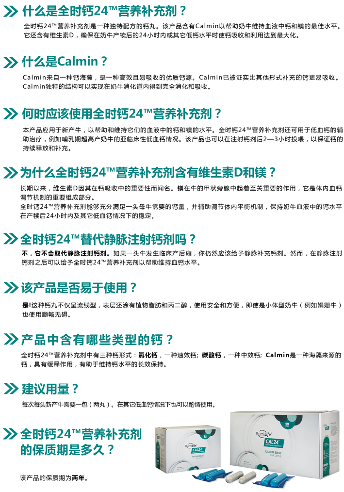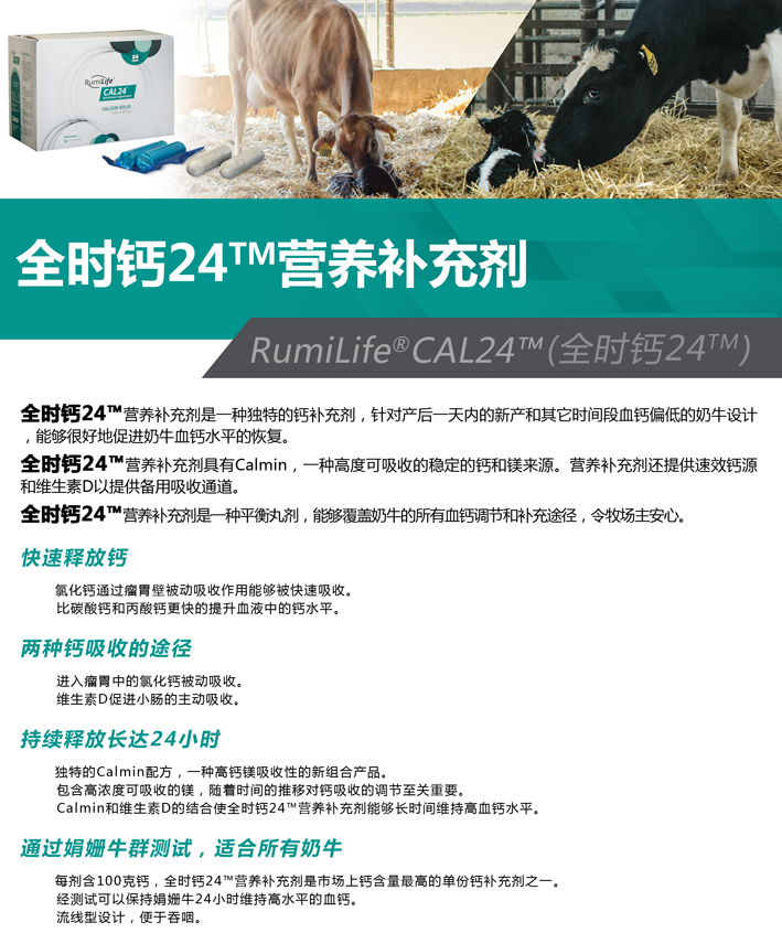 全時(shí)鈣24?營(yíng)養(yǎng)補(bǔ)充劑是一款與眾不同的鈣劑產(chǎn)品。每劑含100g鈣,是鈣含量非常高的產(chǎn)品。包含有快速釋放型鈣——氯化鈣,能夠迅速被瘤胃壁吸收。另一部分組分是Calmin,是一種易吸收的鈣鎂化合物,對(duì)于鈣的吸收調(diào)節(jié)有著重要的促進(jìn)作用。再加上能夠促進(jìn)小腸對(duì)鈣主動(dòng)轉(zhuǎn)運(yùn)的維生素D,使得全時(shí)鈣24?能夠在相當(dāng)長(zhǎng)的時(shí)間內(nèi)給奶牛不斷提供充足的血鈣。通過這些獨(dú)特的組分,全時(shí)鈣24?能夠給新產(chǎn)牛或其它缺鈣奶牛提供長(zhǎng)達(dá)24小時(shí)的充足血鈣補(bǔ)給。